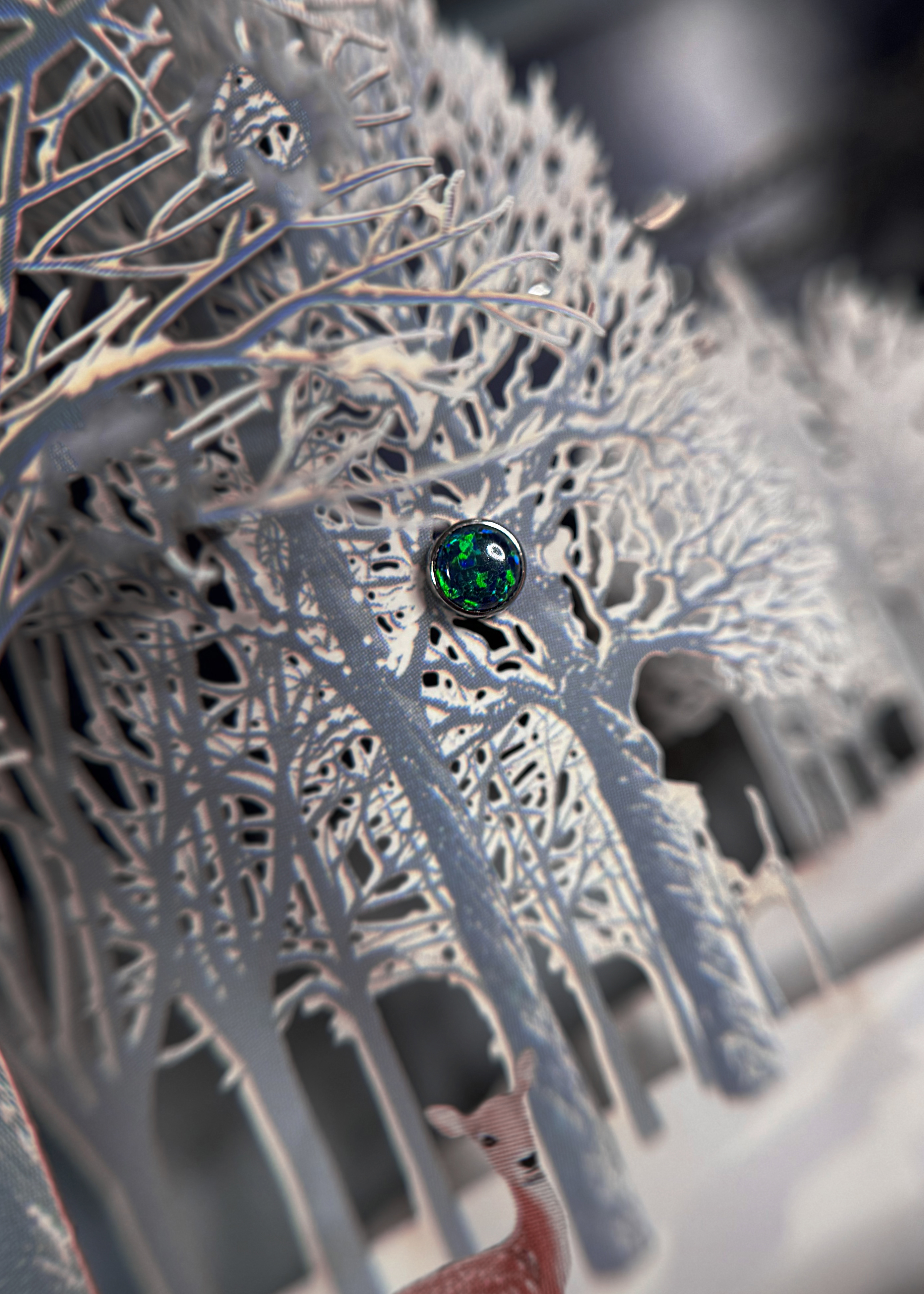 Tytanowy labret z czarnym opalem. W zależności od fragmentu kamienia użytego przy produkcji, nakrętki mogą się od siebie delikatnie różnić wzorem – każda jest unikatowa! Opal to hipnotyzująca gra barw i subtelny urok. To nie tylko ozdoba, ale i amulet – opal od wieków symbolizuje kreatywność, pasję i wewnętrzną harmonię.